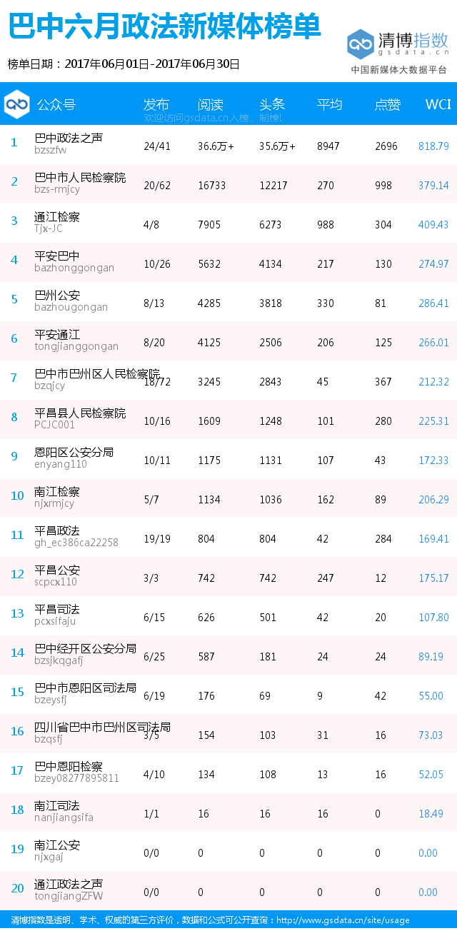 为进一步推进我市新媒体矩阵建设,推动各家政法单位规划提升新媒体运营水平,四川法制报新媒体中心将持续为大家推出巴中市政法系统微信排行榜榜单(数据来源清博指数),囊括了巴中市级法院、巴中市级检察院、巴中市级公安、巴中市级司法局的各家微信公众号,以月为单位推出榜单,以便各家政法单位了解微信数据、调整运营策略、进行长远规划。