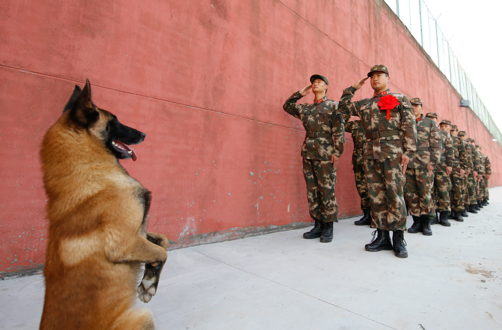 2017年11月28日,军犬“多多”向武警江苏总队宿迁支队泗阳中队的退伍官兵“敬礼”告别。武警江苏总队宿迁支队新闻报道员吴佳洪摄