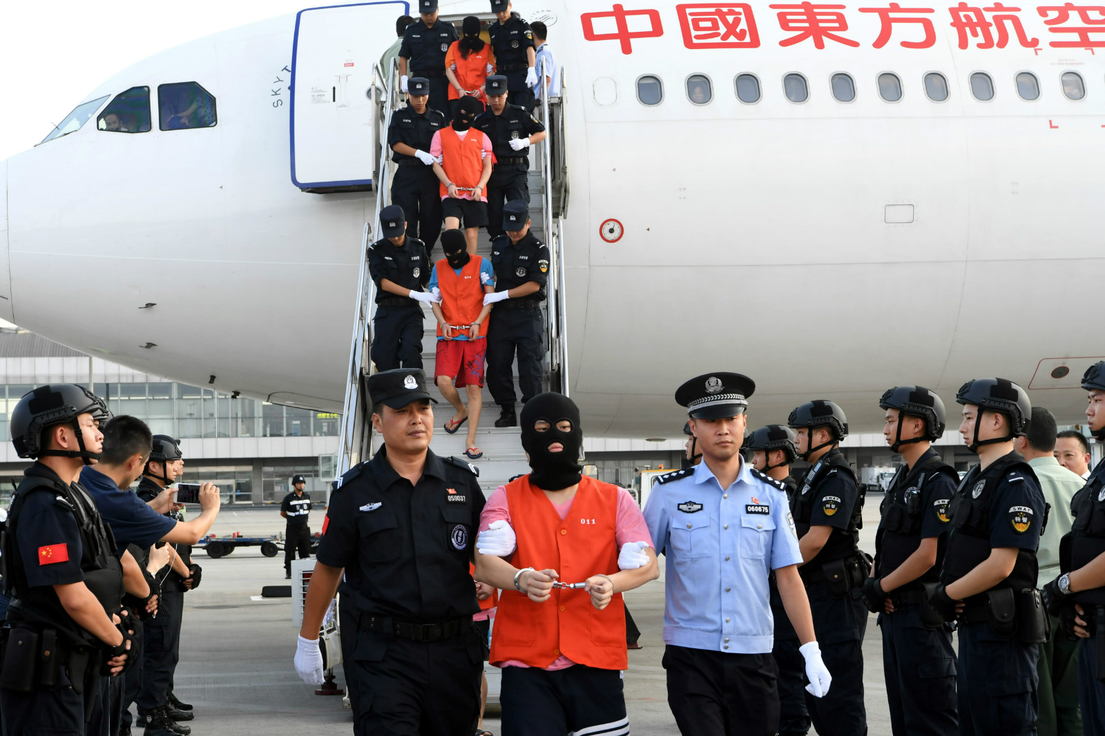 2017年8月3日,一架来自印度尼西亚雅加达的飞机抵达成都双流国际机场,58名电信诈骗犯罪嫌疑人被四川警方押解回国。中新社四川分社记者安源摄