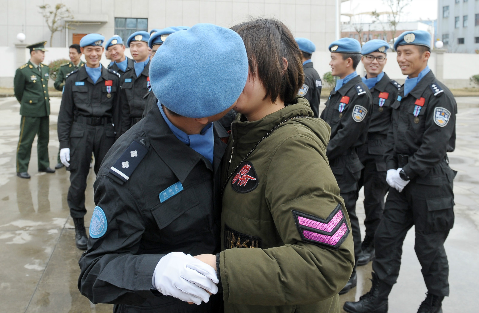 2017年3月20日,中国第四支赴利比里亚维和警察防暴队成员、浙江省公安边防总队舟山市支队士官汪翔龙和前来参加欢迎仪式的妻子许梦莎拥吻。浙江舟山日报社记者吴琳红摄