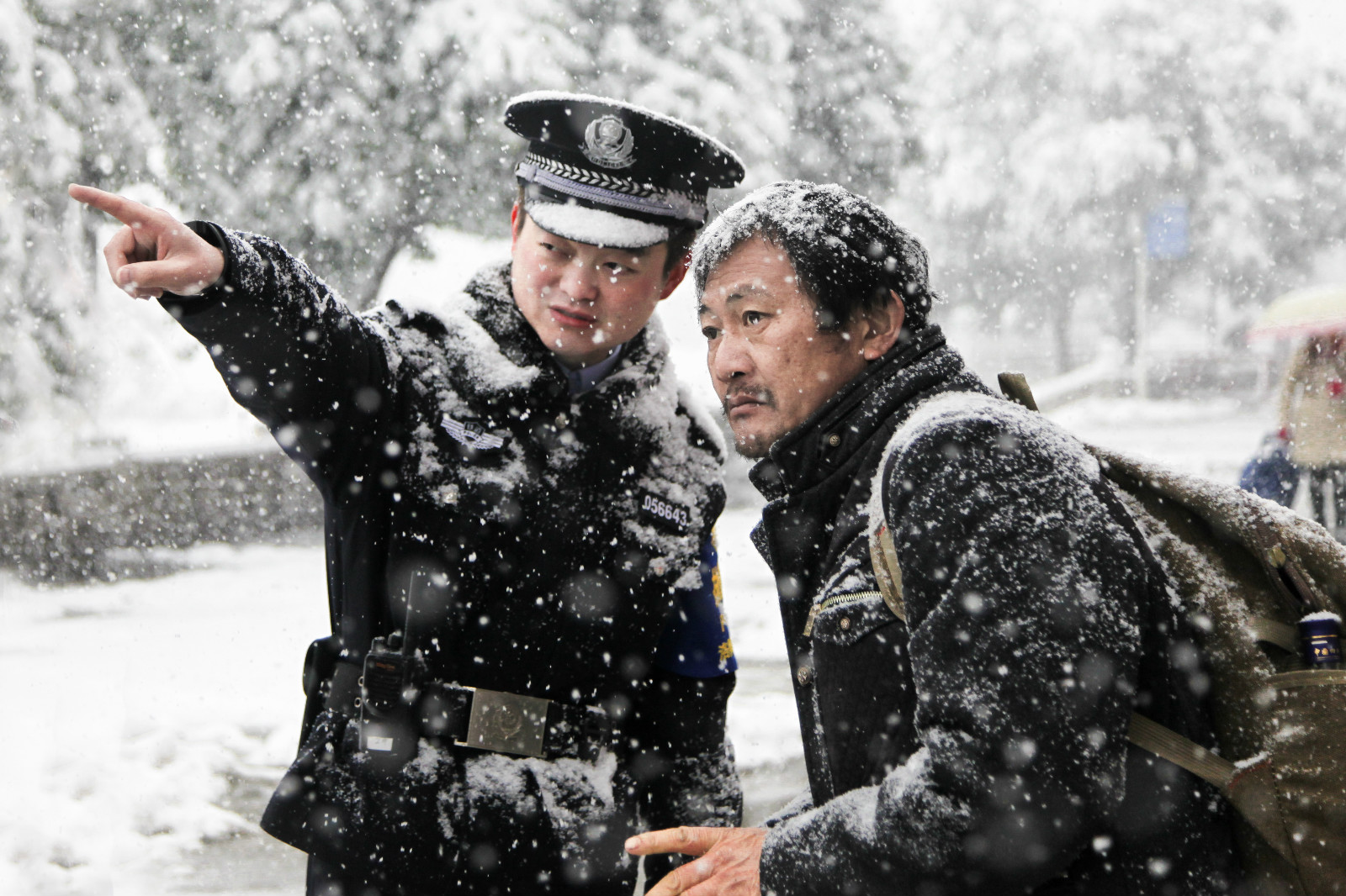 2017年1月22日,河南洛阳火车站广场。风雪中,执勤民警向一名回家心切的旅客提供帮助。河南省郑州铁路公安局洛阳公安处民警陈国军摄
