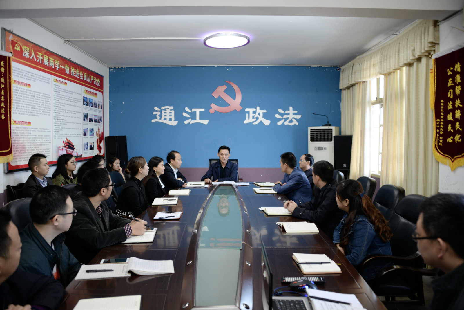 他要求,要强化政治理论学习,自觉提升政治站位。政法机关作为党的“刀把子”,始终坚持把党对政法工作的绝对领导作为第一位要求,不断强化“四个意识”“四个自信”,严守政治纪律、政治法规,在思想上、政治上、行动上以习近平同志为核心的党中央保持高度一致,坚决确保政法工作、正确政治方向。要保持清醒政治头脑,主动服务发展大局。当前,通江正处在加快建设川陕革命老区振新发展示范县的关键期和机遇期,服务经济社会发展大局始终是政法机关的重要职责,政法干部要自觉把新发展理念融入到政法工作中,大力推进严格执法、公正司法、全民守法,不断提升执法司法公信力,净化执法司法环境,努力构建办事依法、遇事找法、解决问题用法、化解矛盾靠法的法治良序。要坚持正确思想指引,务必扎实推动各项工作。按照十九大报告的部署要求,对标年度综合目标任务,稳步推进当前工作,超前谋划好明年工作,扎实抓好维稳、综治、防范、国安等各项工作落实,深入推进政法队伍建设“六大工程”,把学习贯彻党的十九大精神的与“四对照四提升 做忠诚卫士”专题教育和纪律作风专项整顿“回头看”结合起来,营造学习贯彻党的十九大精神的浓厚氛围。