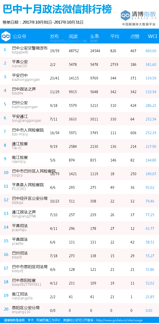 为进一步推进我市新媒体矩阵建设,推动各家政法单位规划提升新媒体运营水平,四川法制报新媒体中心将持续为大家推出巴中市政法系统微信排行榜榜单(数据来源清博指数),囊括了巴中市级法院、巴中市级检察院、巴中市级公安、巴中市级司法局的各家微信公众号,以月为单位推出榜单,以便各家政法单位了解微信数据、调整运营策略、进行长远规划。