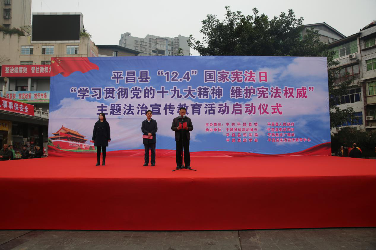 为深入学习贯彻落实党的十九大精神和习近平新时代中国特色社会主义思想,进一步普及宪法知识、弘扬宪法精神,推动全社会树立宪法意识,增强全民法治观念。12月4日上午,平昌县在伯坚广场举办了“12·4”国家宪法日主题法治宣传教育活动启动仪式。启动仪式由平昌县副县长王良双主持,平昌县人大常委会副主任王维东出席仪式并讲话,平昌县司法局局长陈雨珍参加启动仪式。